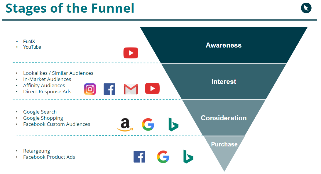 1. By investing heavily in the top of the funnel, we are ensuring that we reach new users via interest and demographic targeting on both Facebook, YouTube, and the Google Display Network.