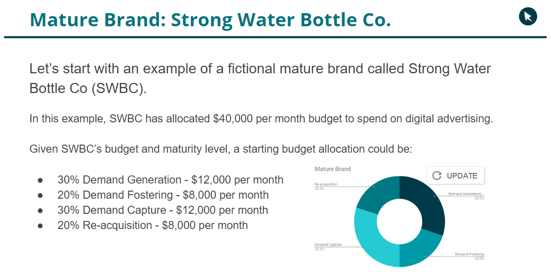 You’ll notice that Strong Water Bottle Co. uses many of the same ad units, but the budgeting has been rearranged to place marketing resources toward the middle and bottom of the funnel.