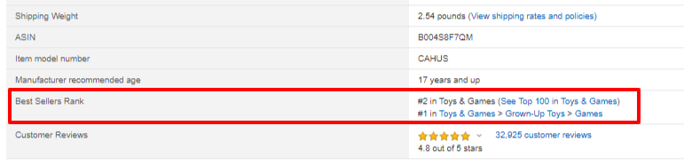 For instance, Cards against Humanity (below), ranks #2 in “Toys and Games” and #1 in the more granular subcategory of “Toys and Games > Grown-Up Toys > Games”.